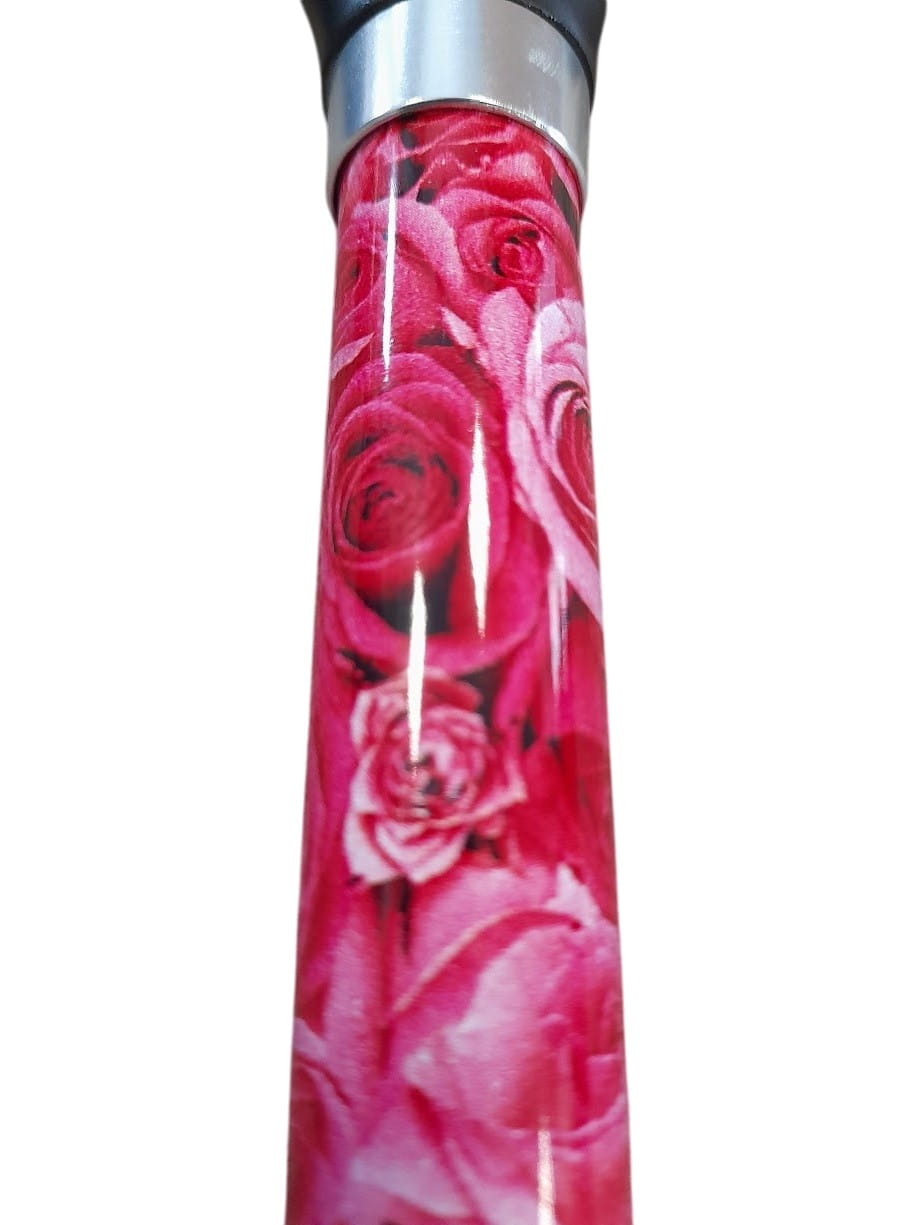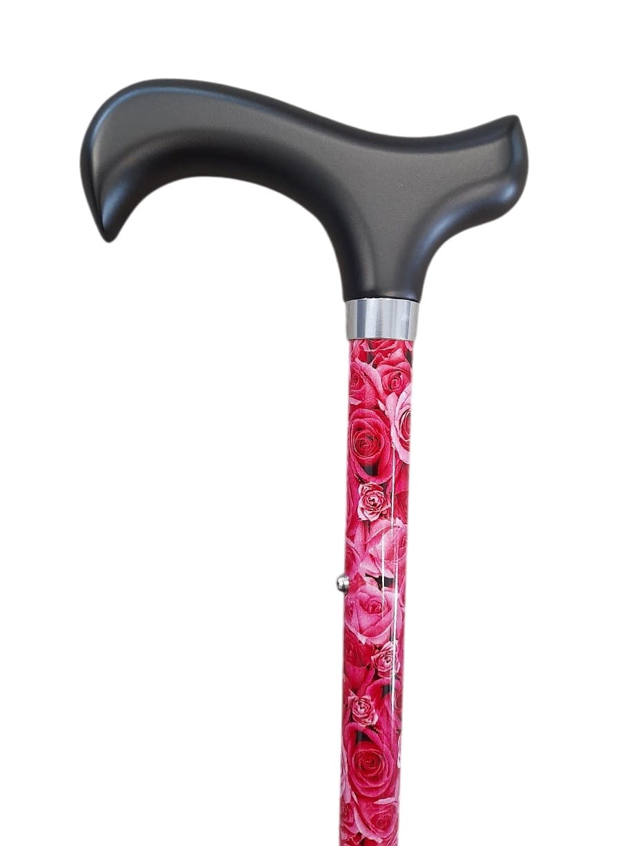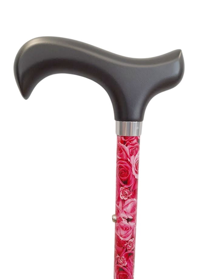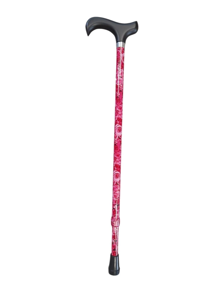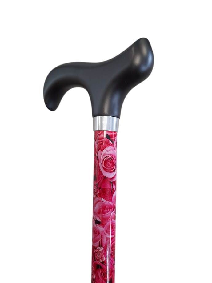 Laska do chodzenia z wytrzymałego błyszczącego metalu z dekoracją kwiatową i z rączką derby. Posiada możliwość regulacji wysokości od 72 do 94,5 cm.