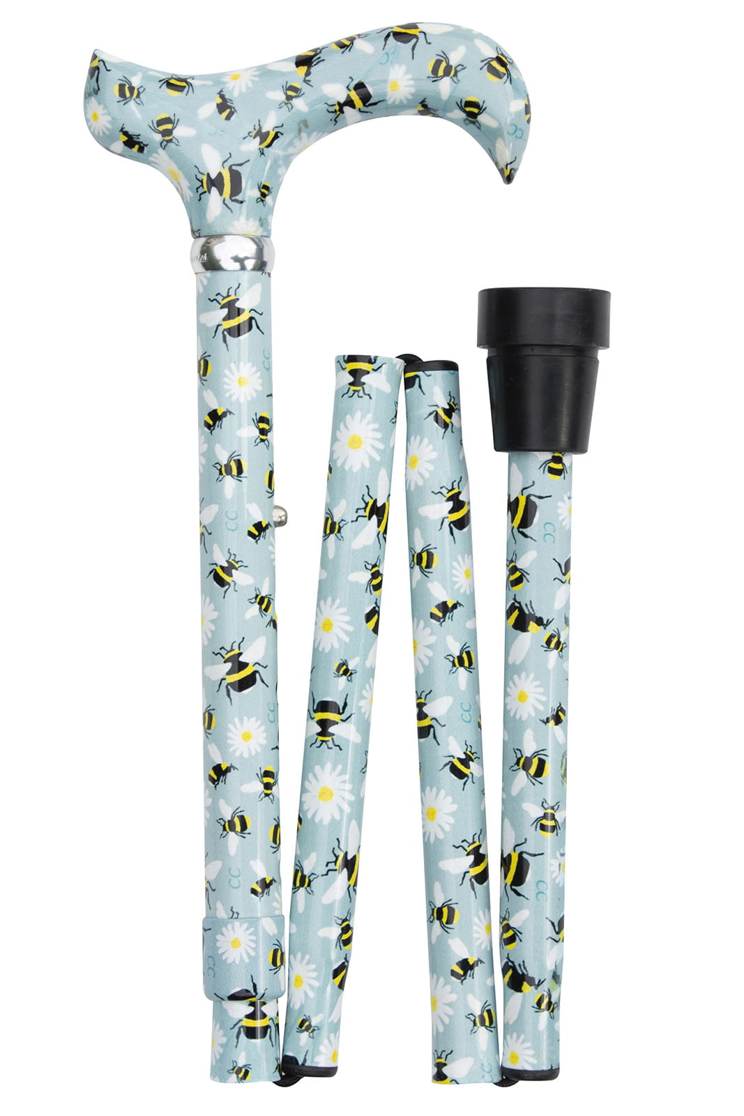 Wesoła składana laska w czarno-żółte pszczoły z białymi kwiatami stokrotek na wodnym niebieskim tle. Projekt oparty jest na ręcznie malowanym oryginale autorstwa dyrektor generalnej Classic Canes, Charlotte Gillan. Składana laska ma regulowaną wysokość od 82 do 92 cm, dzięki czemu można ją dostosować do szerokiego grona użytkowników. Trzonek wykonany jest z wysokiej jakości aluminium, wyposażony w antypoślizgową gumową skuwkę. Posiada chromowany kołnierz i rączkę typu derby, elegancko wyprofilowaną, aby zapewnić wygodne podparcie.