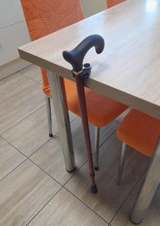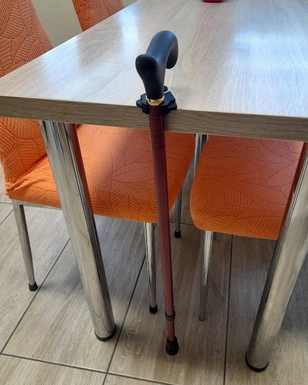 Dzięki klipsowi można wygodnie zawiesić laskę na krawędzi stołu, zapobiegając jej przewracaniu się lub odkładaniu w trudno dostępne miejsca.